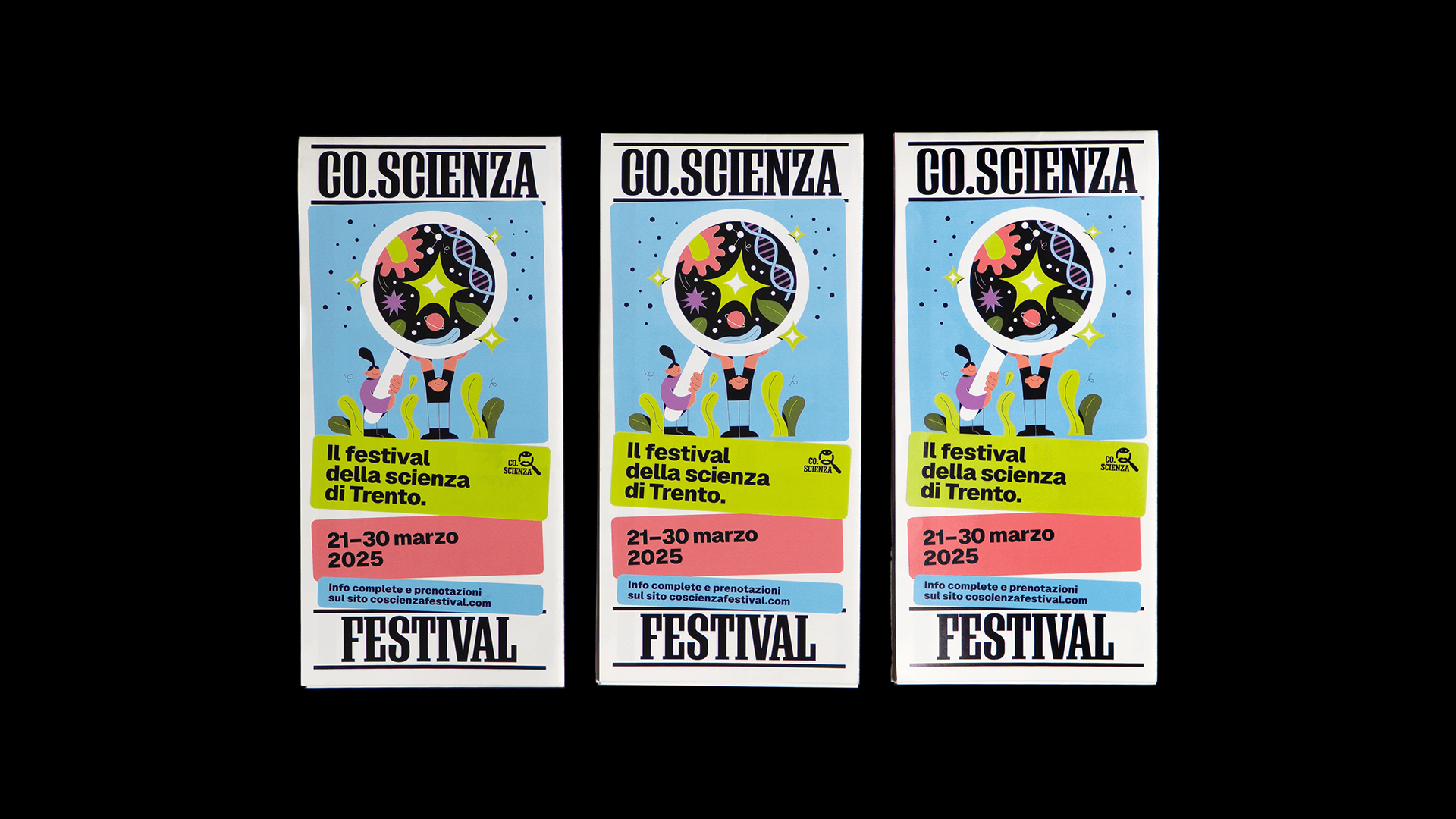 Co.Scienza Festival is an annual event in Trento dedicated to science communication, organized by Co.Scienza — a project born to foster scientific awareness and to connect citizens and students with the world of science and research through debates, workshops, and conferences. While the festival had built a reputation for engaging content and enthusiastic participation, it lacked a clear and cohesive visual identity. To elevate its presence and ensure long-term recognizability, we were brought in to develop a strong, coherent image system capable of supporting and promoting the festival consistently across editions.